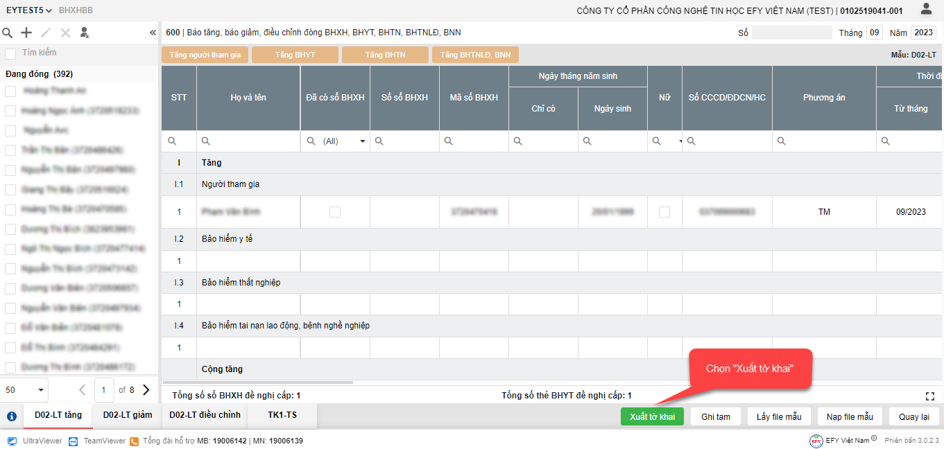 - Bước 1. Sau khi hoàn tất kê khai các thông tin của người tham gia ở tất cả các tab trên lưới kê khai, chọn Xuất tờ khai
