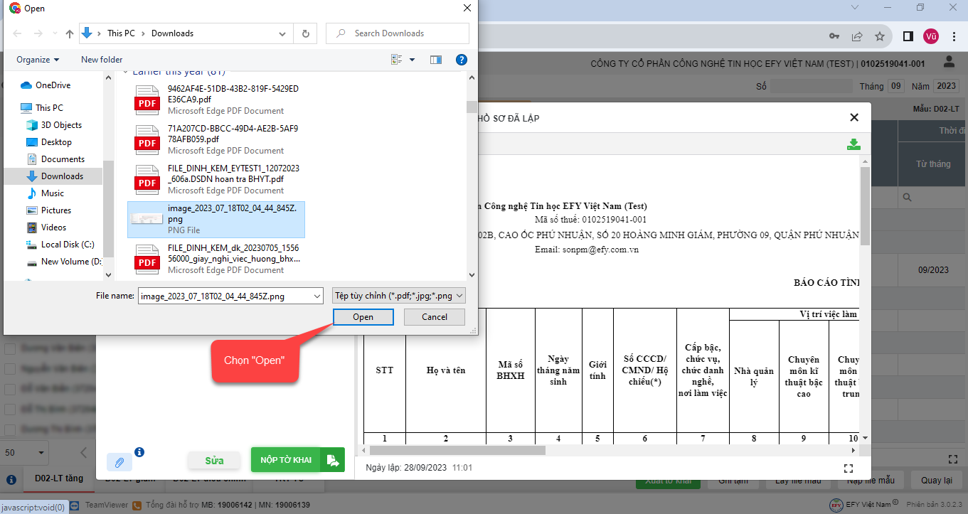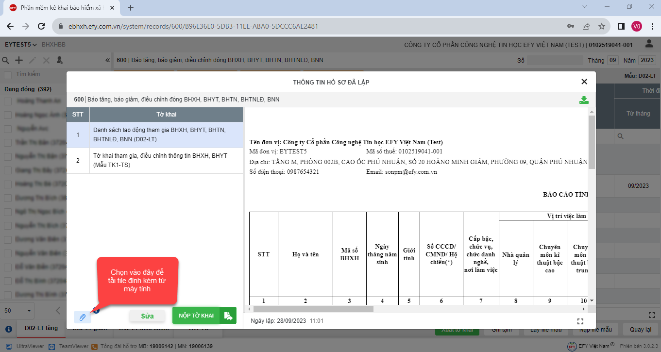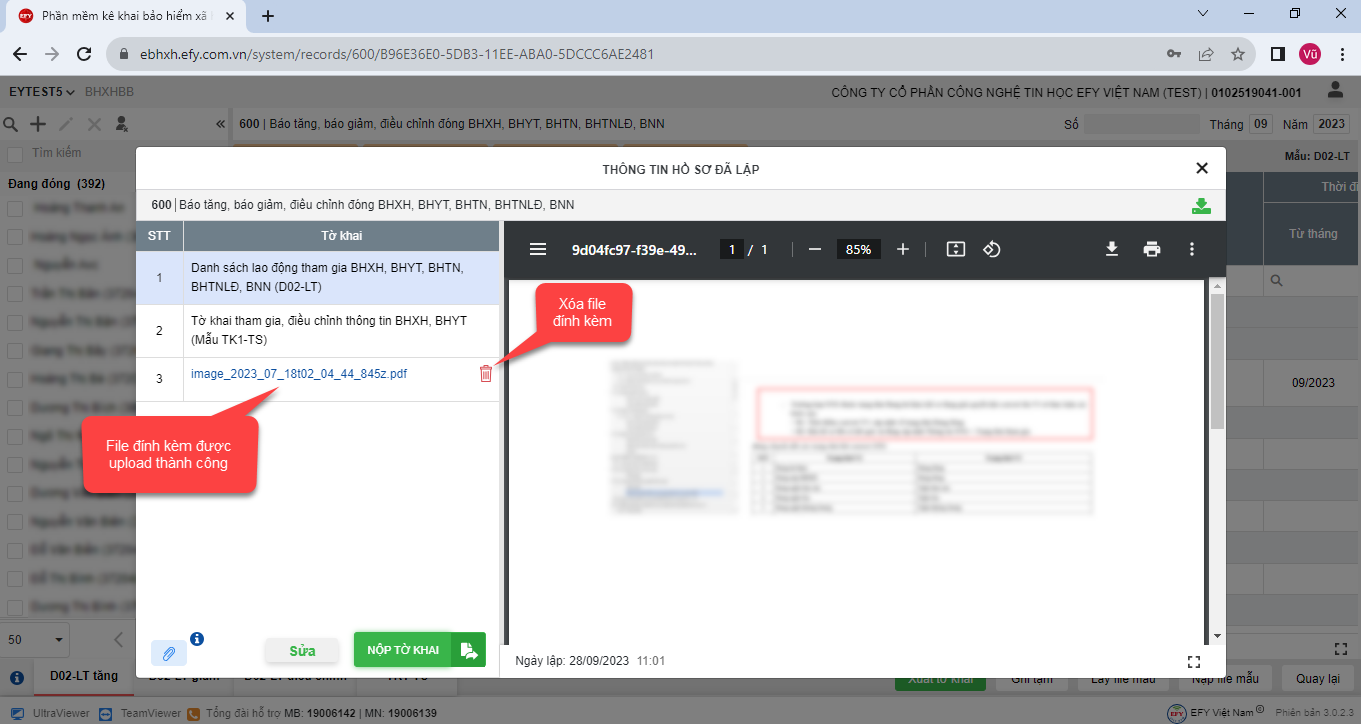- Như vậy bạn đã hoàn thành việc đính kèm các file văn bản liên quan vào hồ sơ trên trên hệ thống EFY-eBHXH 3.0
