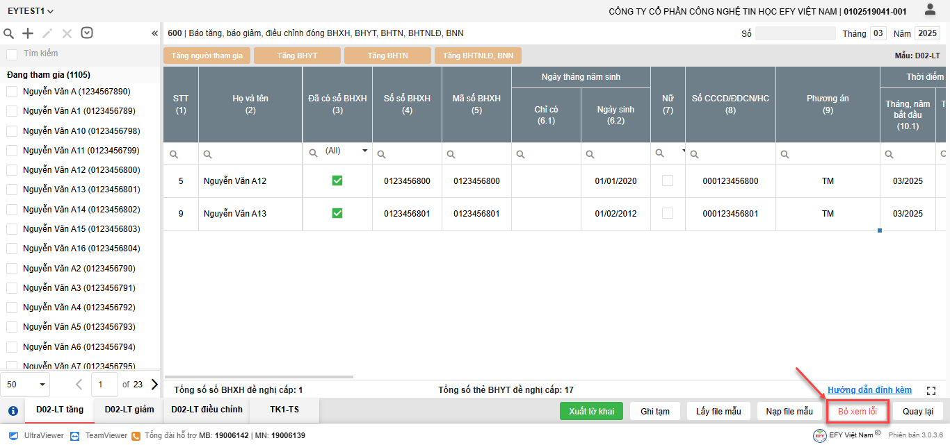 - Nhấn Bỏ xem lỗi để quay lại toàn bộ danh sách lao động đang kê khai