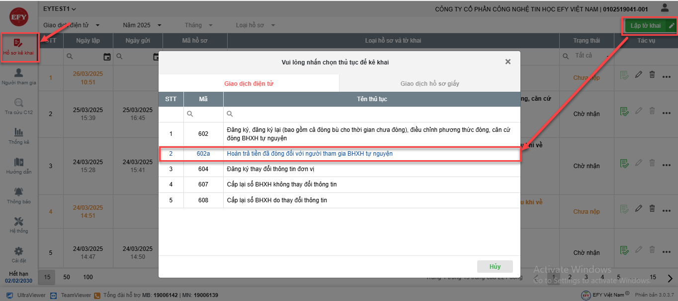 - Trong tab Giao dịch điện tử => chọn thủ tục 602a