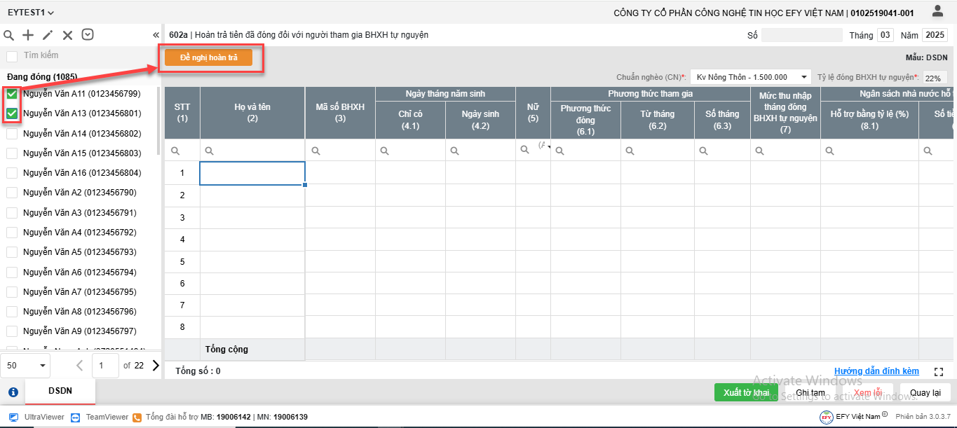Tích chọn lao động muốn thêm vào thủ tục => Chọn hình thức kê khai (Đề nghị hoàn trả)