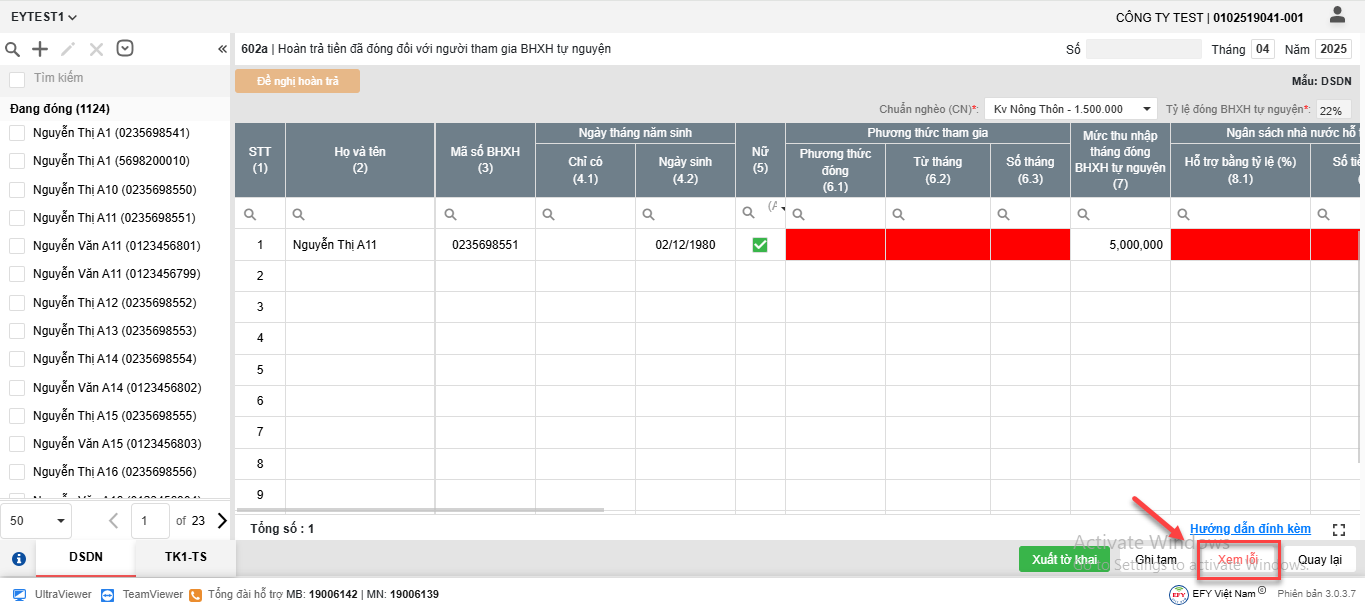 - Chỉnh sửa, bổ sung và kiểm tra các thông tin còn thiếu trực tiếp tại dòng lao động (các ô báo đỏ) theo từng biểu mẫu.