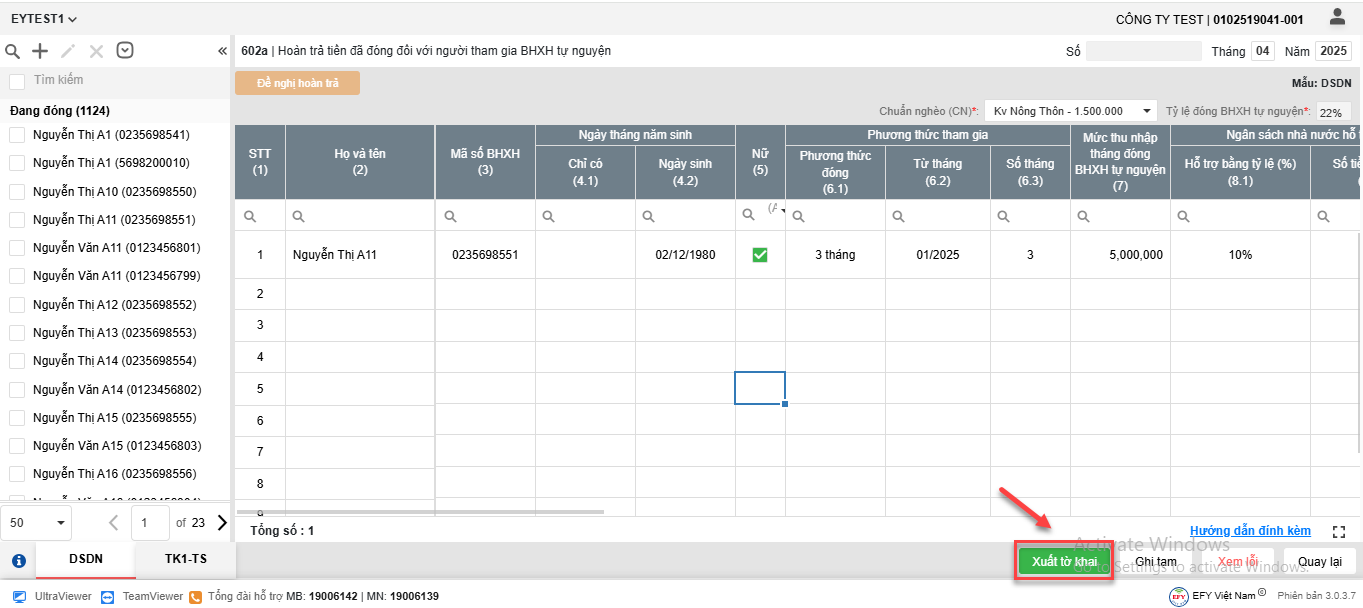 - Sau khi thêm lao động và bổ sung đầy đủ thông tin tại các biểu mẫu, nhấn Xuất tờ khai
