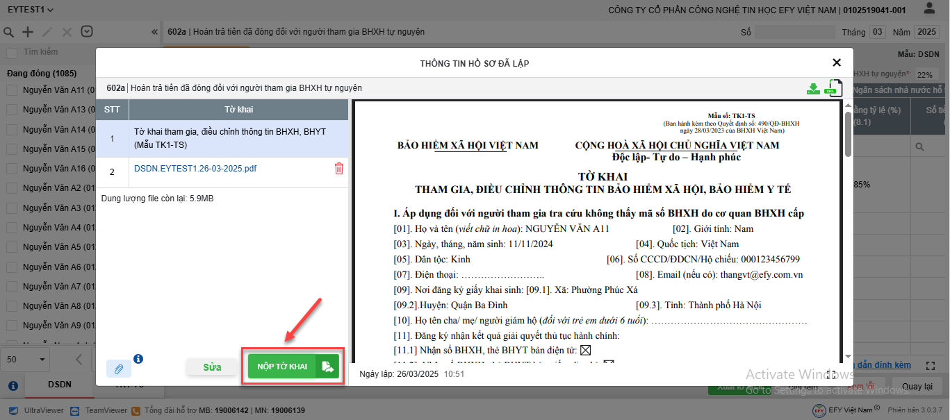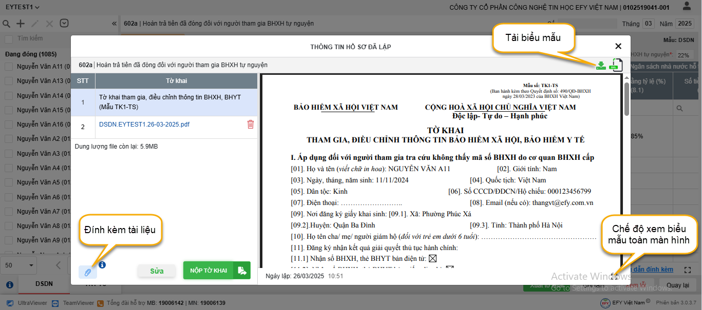 - Phần mềm tự động sinh mẫu DSDN đính kèm vào hồ sơ gửi lên cơ quan BHXH