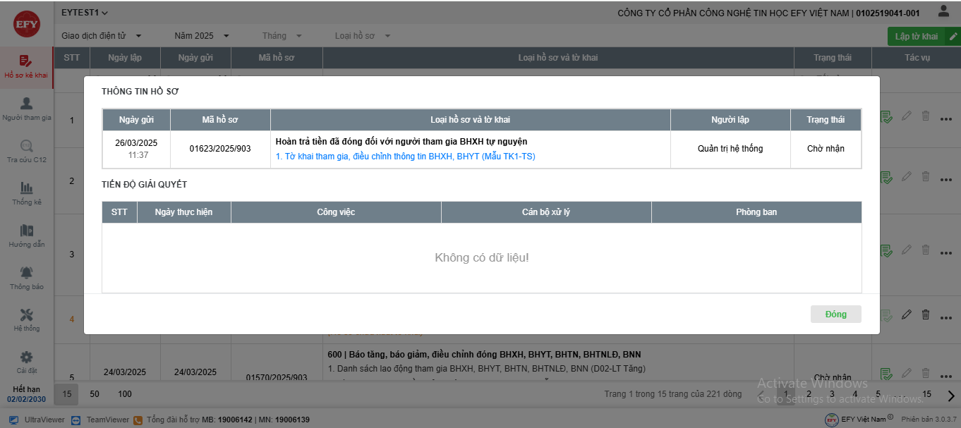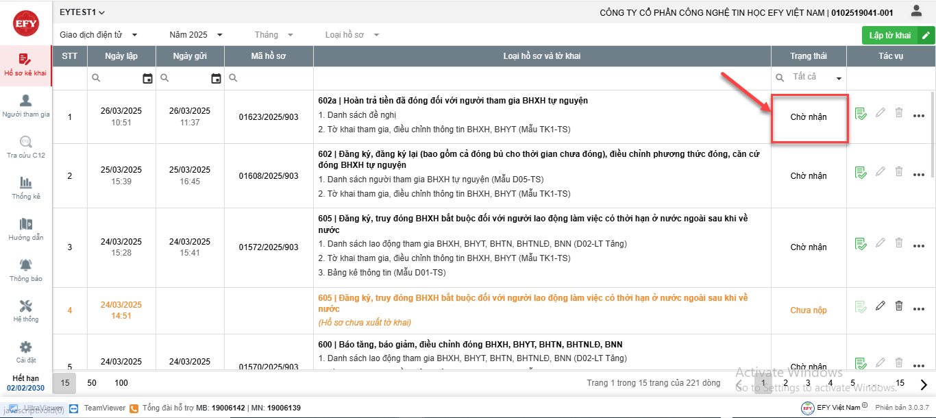 - Hồ sơ sau khi ký nộp sẽ được chuyển lên cơ quan BHXH tiếp nhận và cập nhật trạng thái về phần mềm. Anh/Chị có thể theo dõi trạng thái hồ sơ tại cột Trạng thái