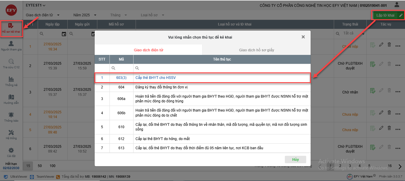- Trong tab Giao dịch điện tử => chọn thủ tục 603(3)