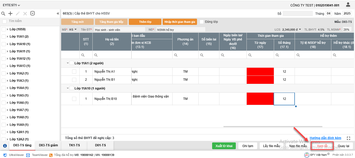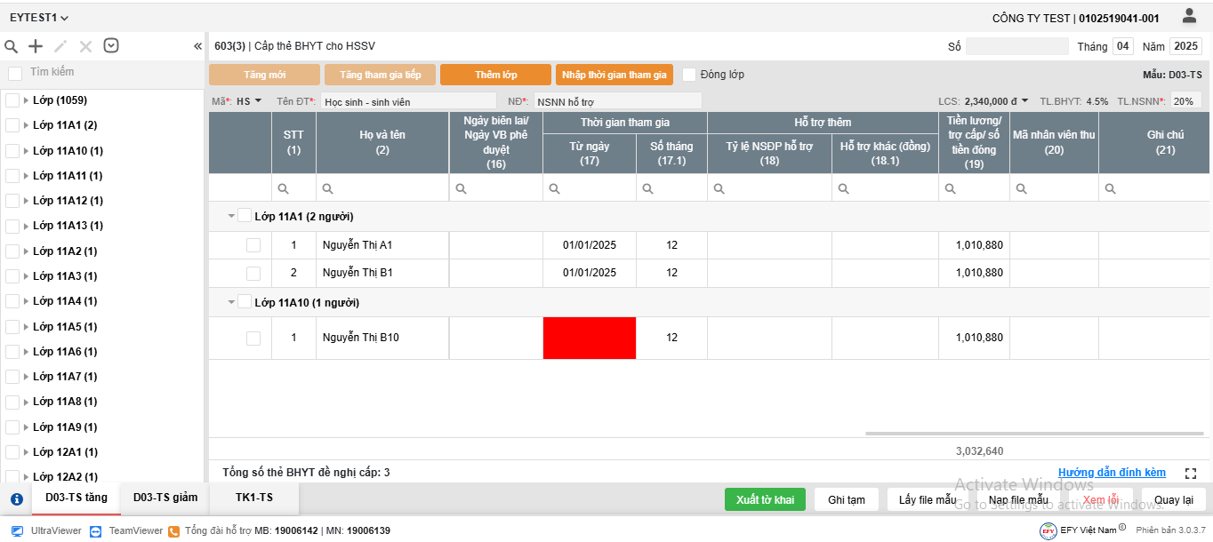 - Chỉnh sửa, bổ sung và kiểm tra các thông tin còn thiếu trực tiếp tại dòng lao động (các ô báo đỏ, báo vàng) theo từng biểu mẫu.