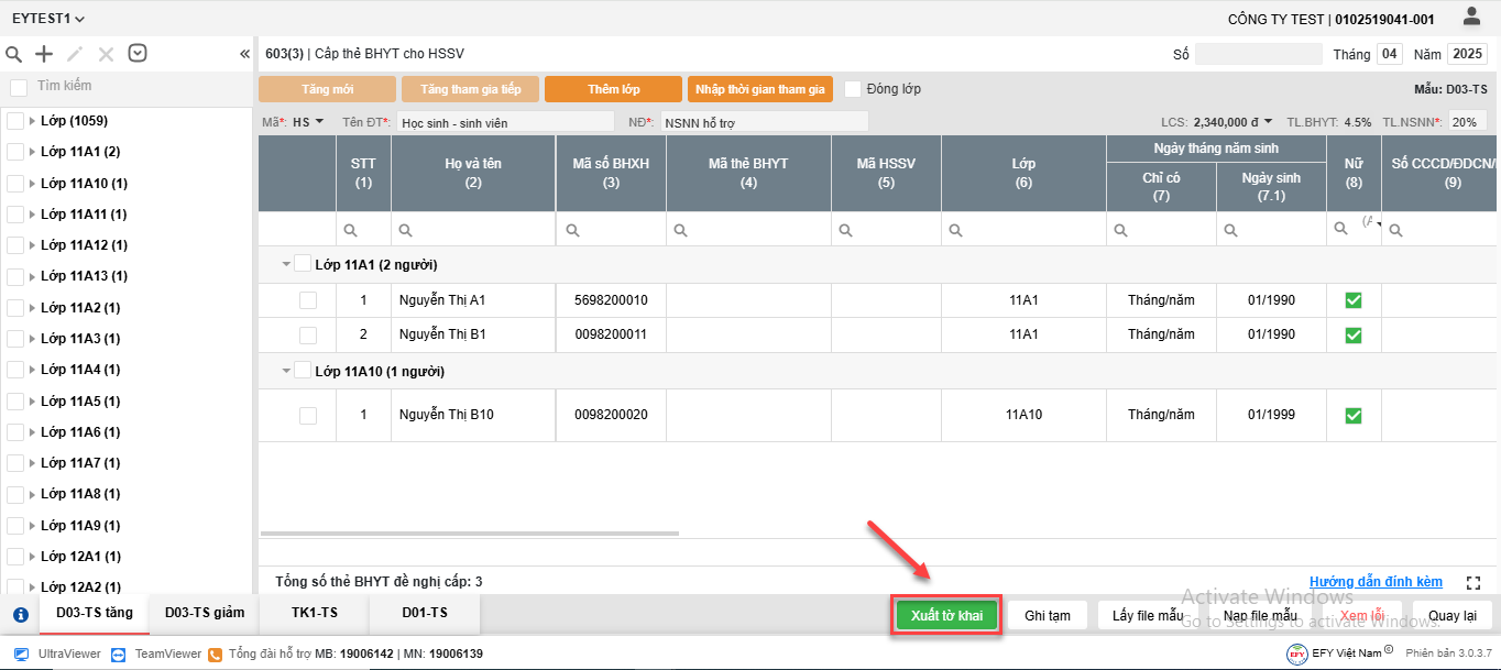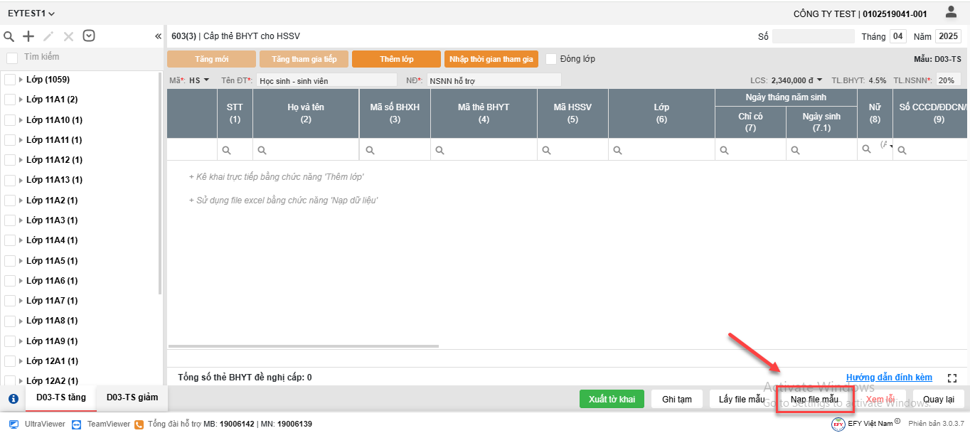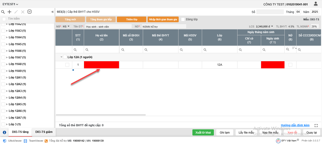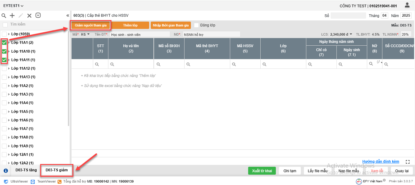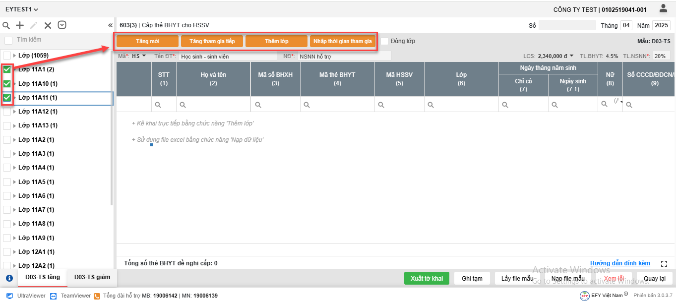 - Cách 1: Nhấn Thêm lớp và nhập trực tiếp Người tham gia vào lưới kê khai