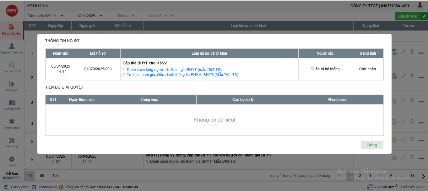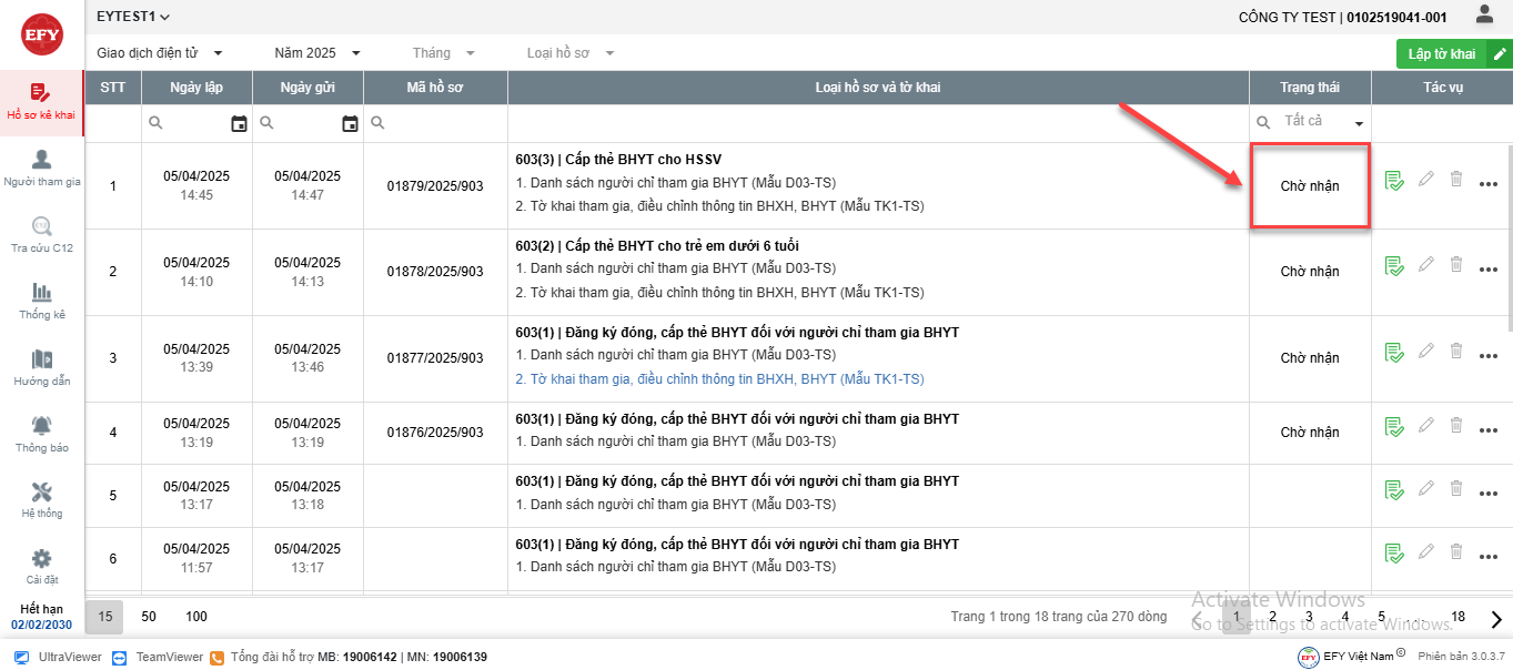 - Hồ sơ sau khi ký nộp sẽ được chuyển lên cơ quan BHXH tiếp nhận và cập nhật trạng thái về phần mềm. Anh/Chị có thể theo dõi trạng thái hồ sơ tại cột Trạng thái