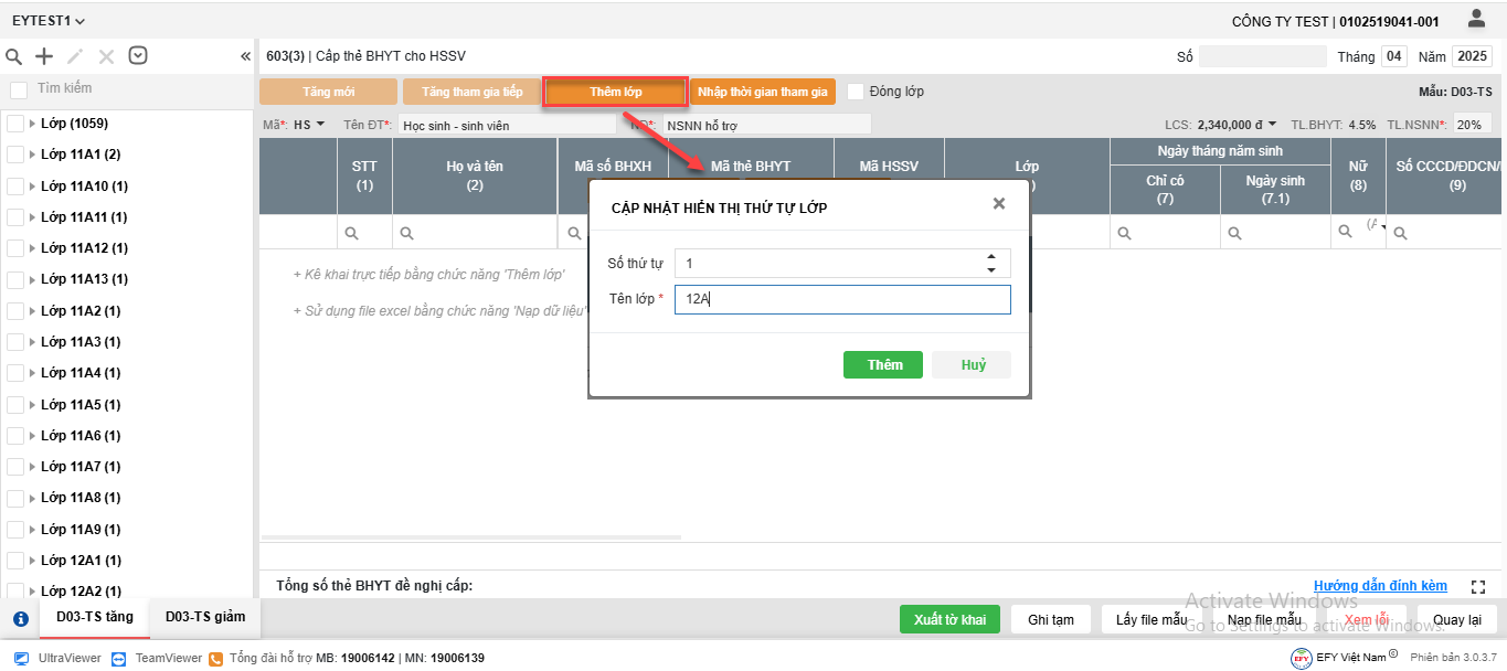 Nhấn vào Thêm lớp => Hiển thị màn cập nhật thông tin lớp, chọn số thứ tự* và nhập Tên lớp. Nhấn Thêm => hệ thống thêm lớp vào lưới kê khai