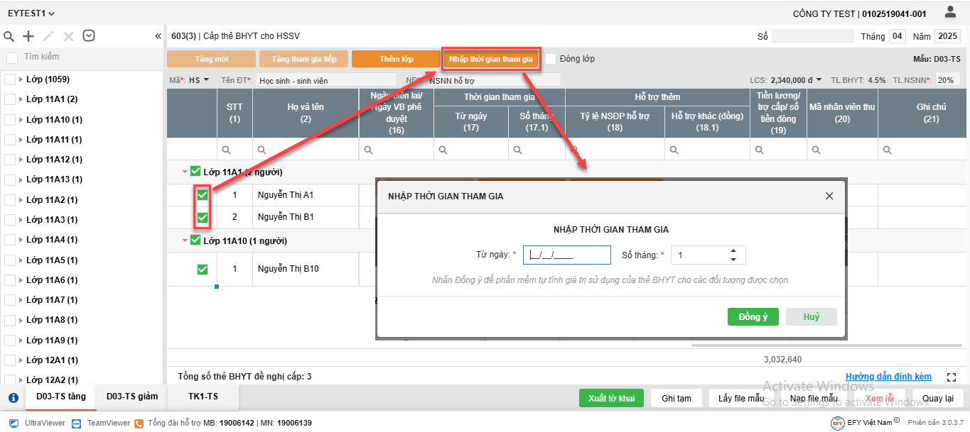 - Tích chọn nhiều người tham gia, nhấn vào nút Nhập thời gian tham gia => Hệ thống hiển thị màn hình Nhập thời gian tham gia, nhập Từ ngày và Số tháng rồi nhấn Đồng ý để phần mềm tự tính giá trị sử dụng của thẻ BHYT cho các đối tượng được chọn