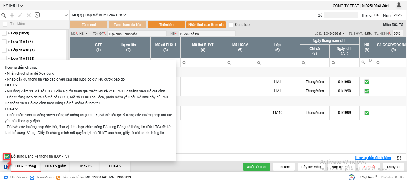 - Chọn biểu tượng hướng dẫn (i) => Tích chọn Bổ sung bảng kê thông tin (D01-TS)