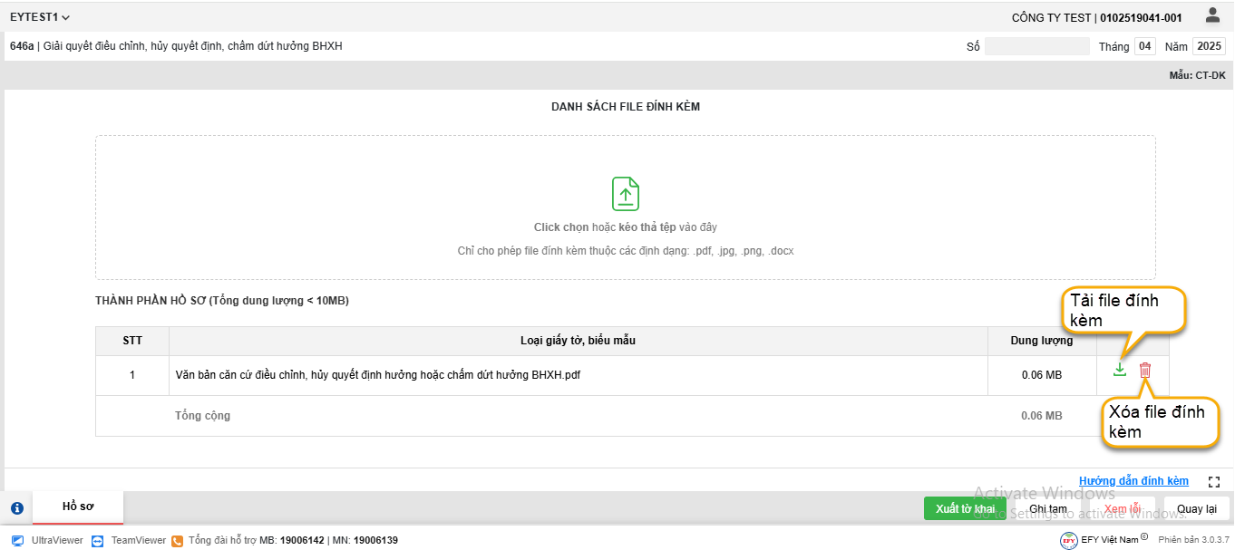 - Trường hợp muốn tải xuống hoặc xóa file đã tải đính kèm => Nhấn vào biểu tượng tương ứng để thực hiện
