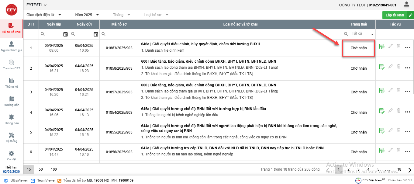 - Hồ sơ sau khi ký nộp sẽ được chuyển lên cơ quan BHXH tiếp nhận và cập nhật trạng thái về phần mềm. Anh/Chị có thể theo dõi trạng thái hồ sơ tại cột Trạng thái