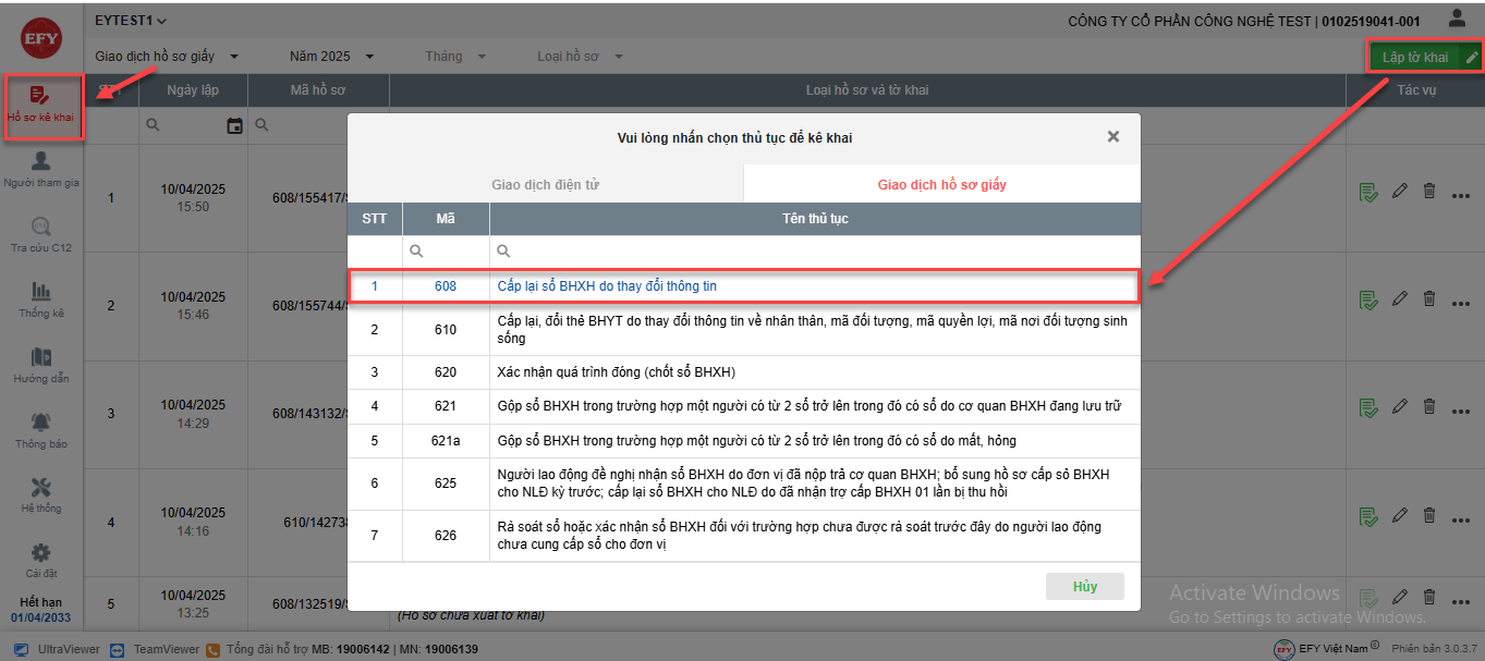 - Trong tab Giao dịch hồ sơ giấy => chọn thủ tục 608