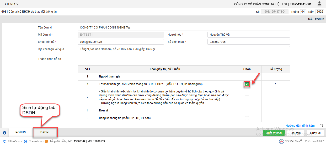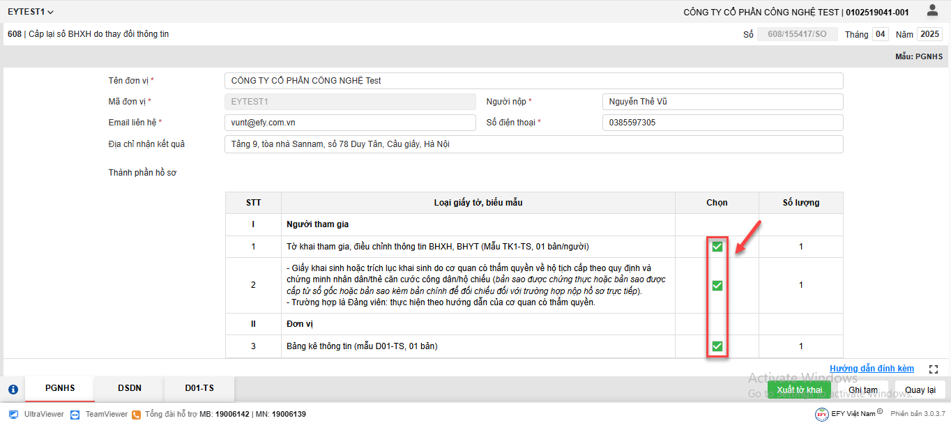 - Tại bảng thành phần hồ sơ => Tích chọn vào ô phần I mục 1