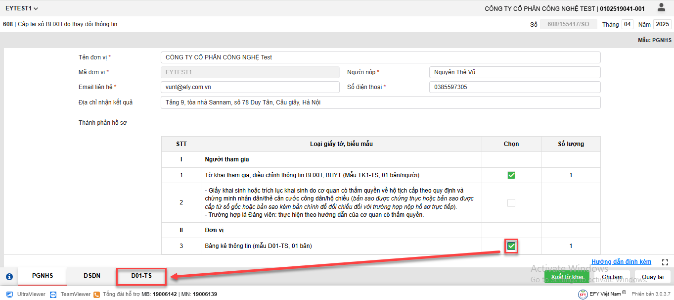 Trường hợp đơn vị muốn kê khai bổ sung thêm biểu mẫu D01-TS thì thực hiện như sau: