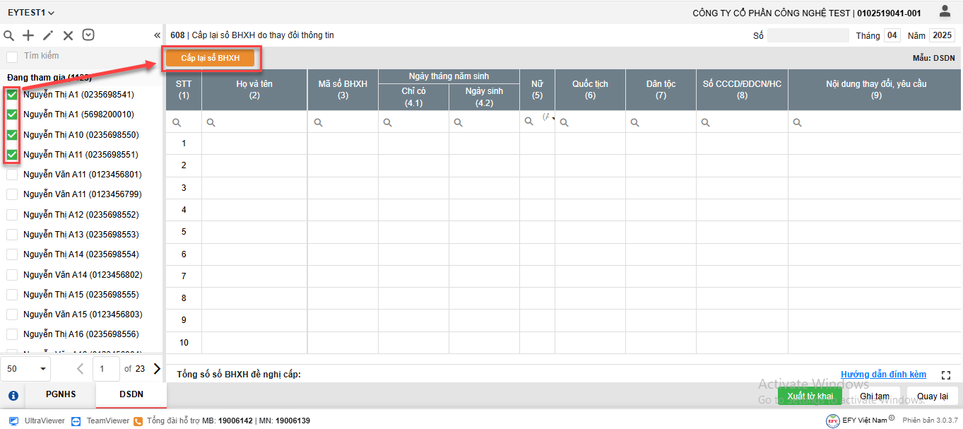 Lưu ý: Cột số lượng hiển thị theo số người lao động được khai báo bên tab DSDN