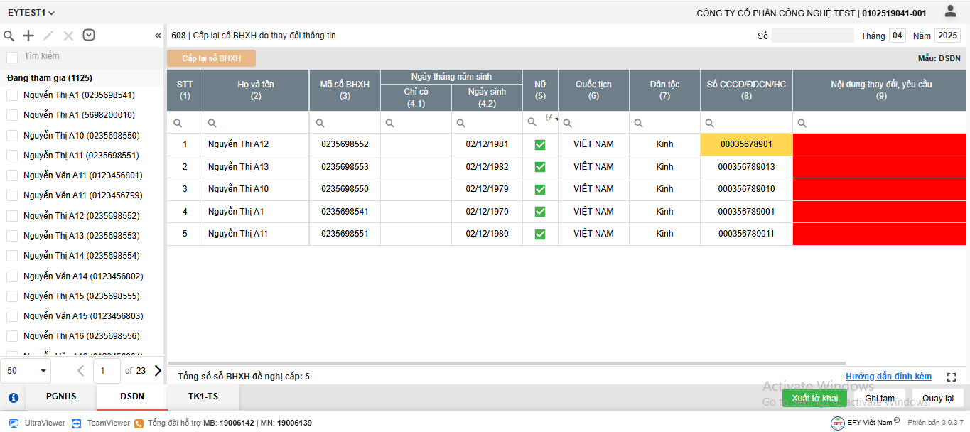 - Chỉnh sửa, bổ sung và kiểm tra các thông tin còn thiếu trực tiếp tại dòng lao động (các ô báo đỏ, báo vàng) theo từng biểu mẫu.