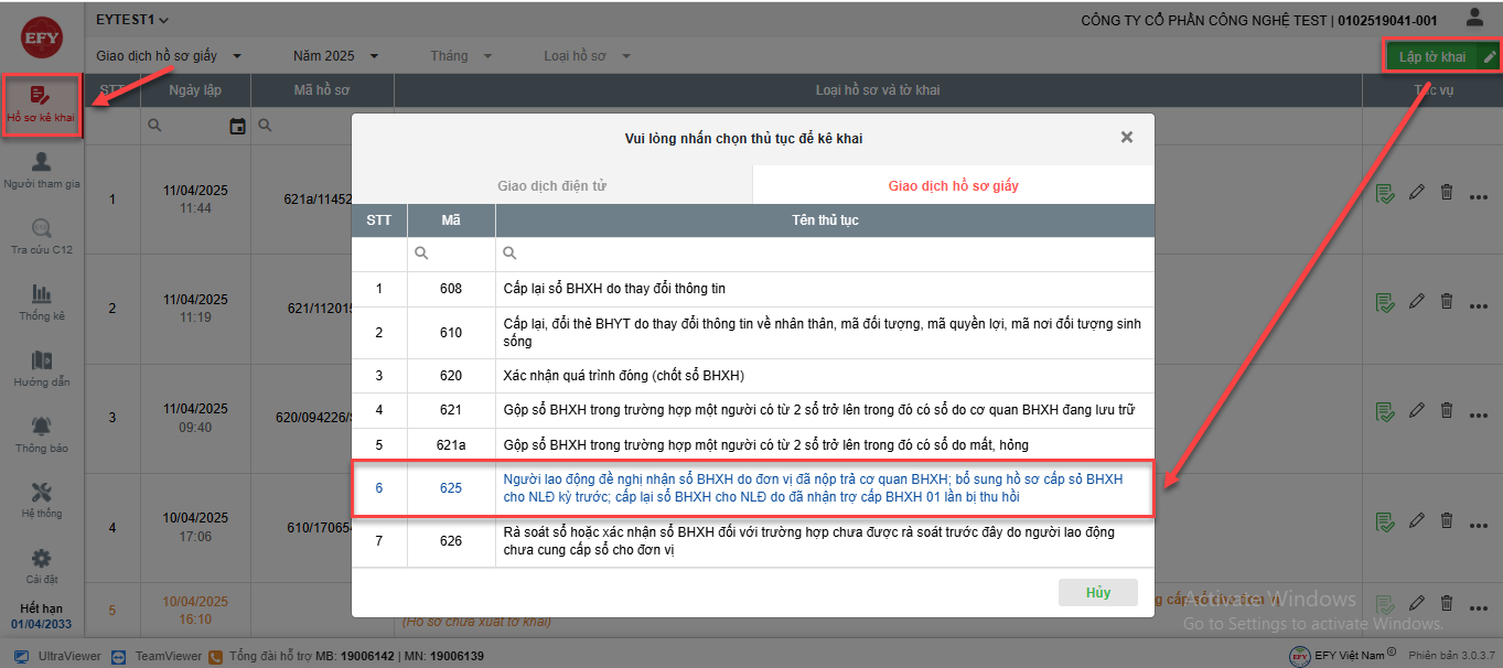 - Trong tab Giao dịch hồ sơ giấy => chọn thủ tục 625
