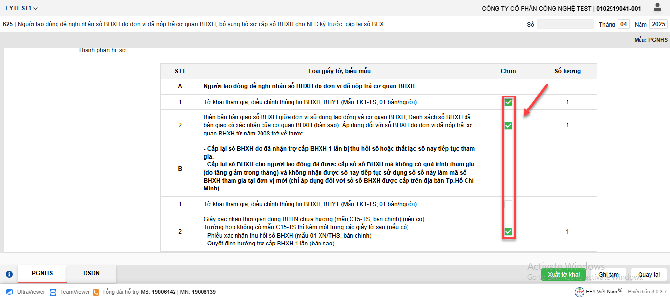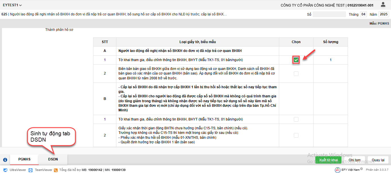 - Tại bảng thành phần hồ sơ => Tích chọn vào ô phần A mục 1.