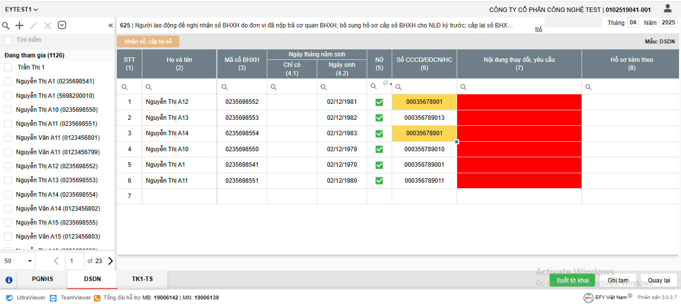 - Chỉnh sửa, bổ sung và kiểm tra các thông tin còn thiếu trực tiếp tại dòng lao động (các ô báo đỏ, báo vàng) theo từng biểu mẫu.