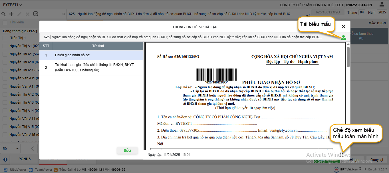 - Phầm mềm tự động đưa lao động vào các biểu mẫu tương ứng. Anh/chị xem lại thông tin và chọn từng biểu mẫu tải về để gửi hồ sơ lên BHXH