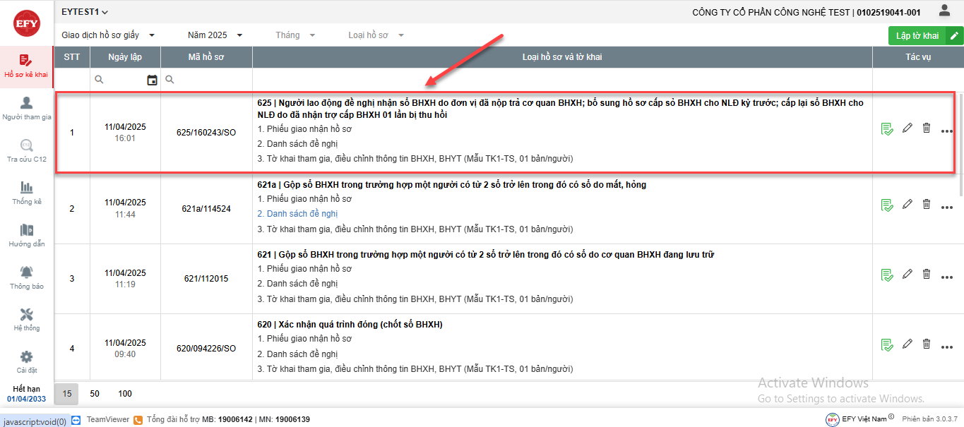 - Hồ sơ sau khi khai báo sẽ được lưu lại ở màn danh sách. Anh/Chị có thể xem lại hồ sơ đã khai báo tại màn danh sách