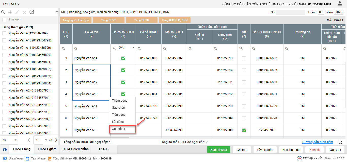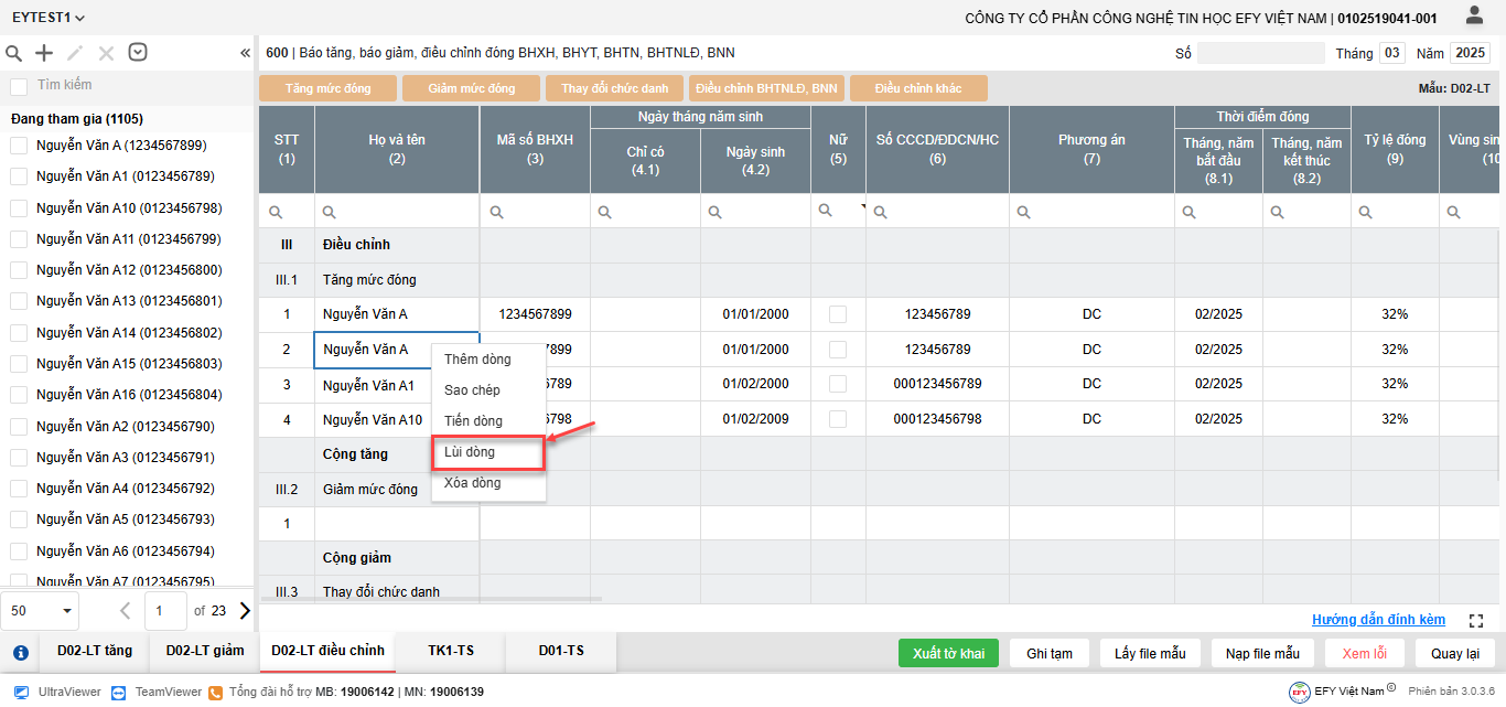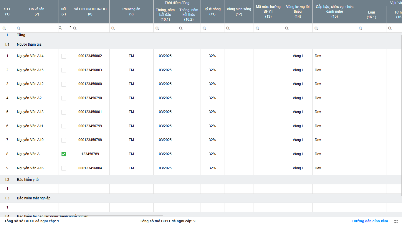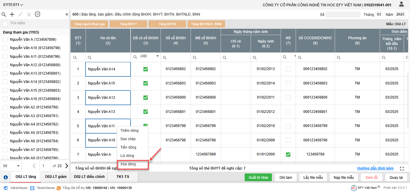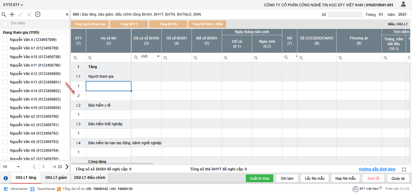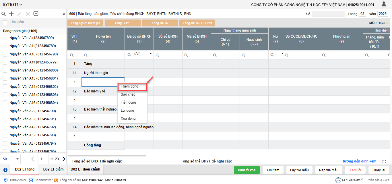 - Thêm dòng: thêm dòng mới để nhập thông tin người tham gia trên lưới kê khai