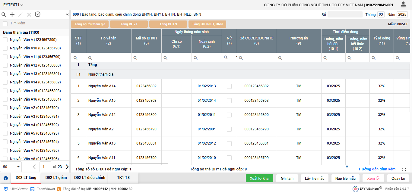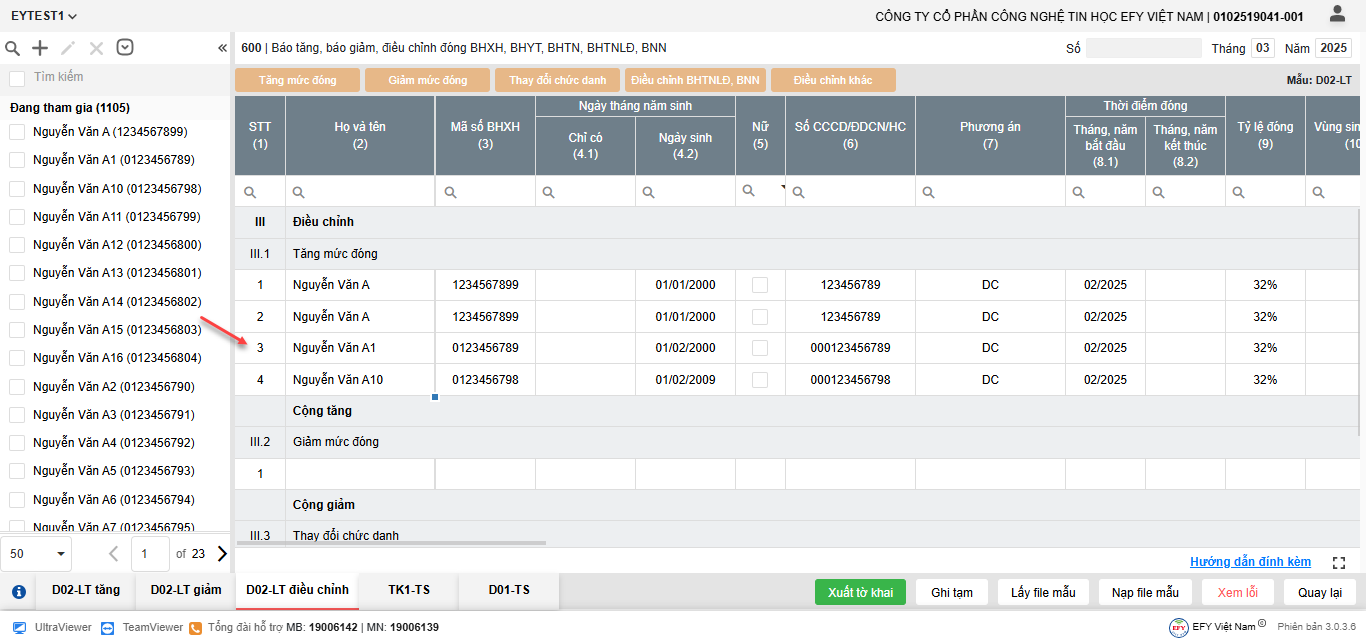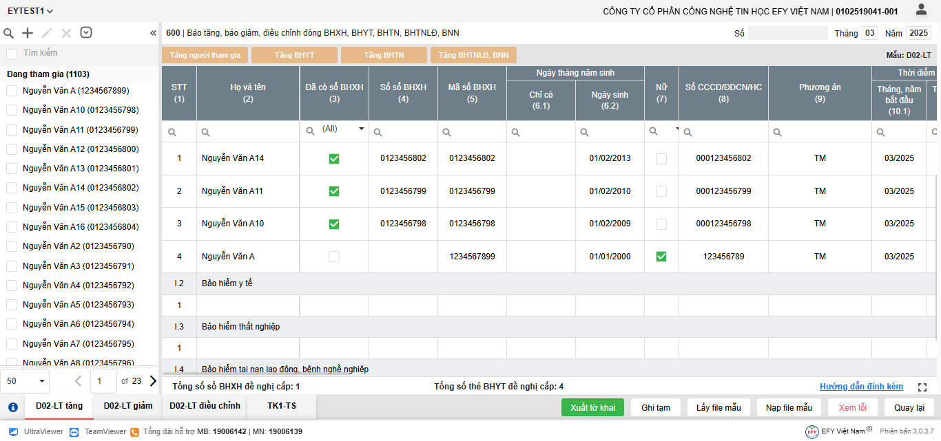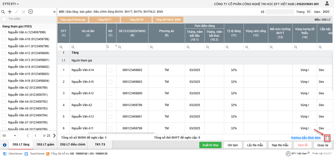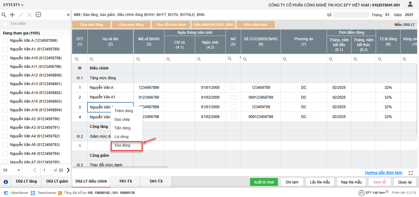 - Thêm dòng: thêm dòng mới để nhập thông tin người tham gia trên lưới kê khai