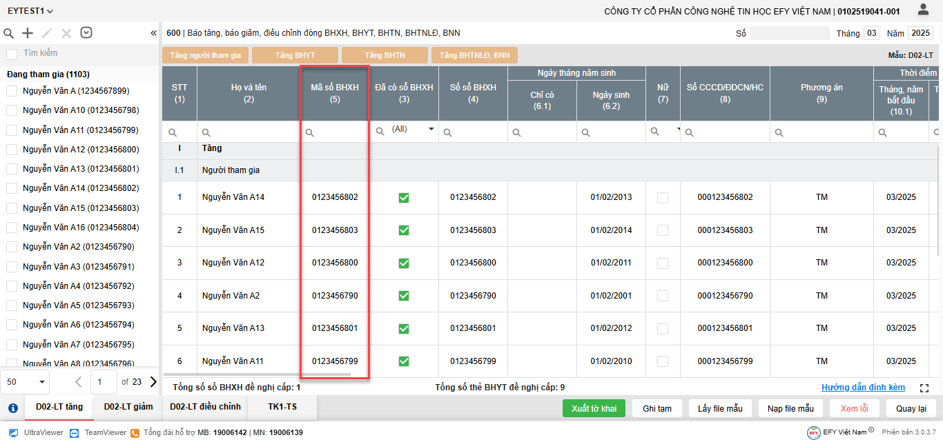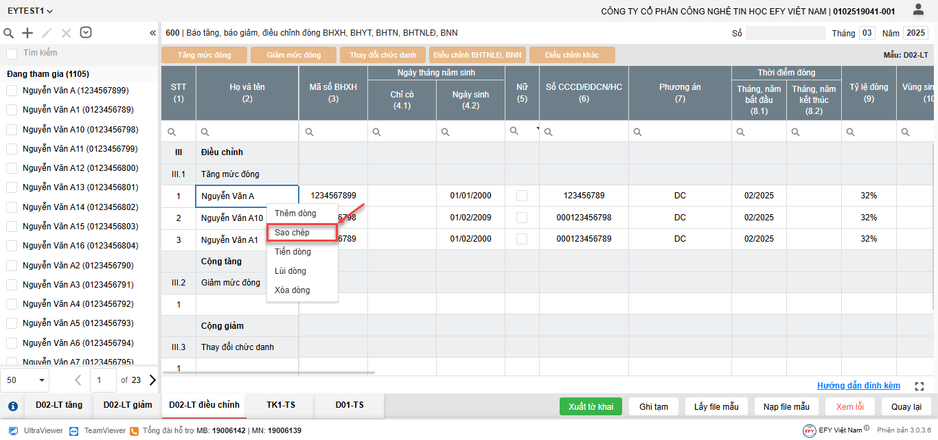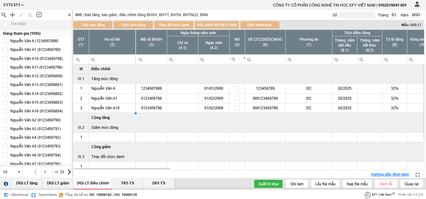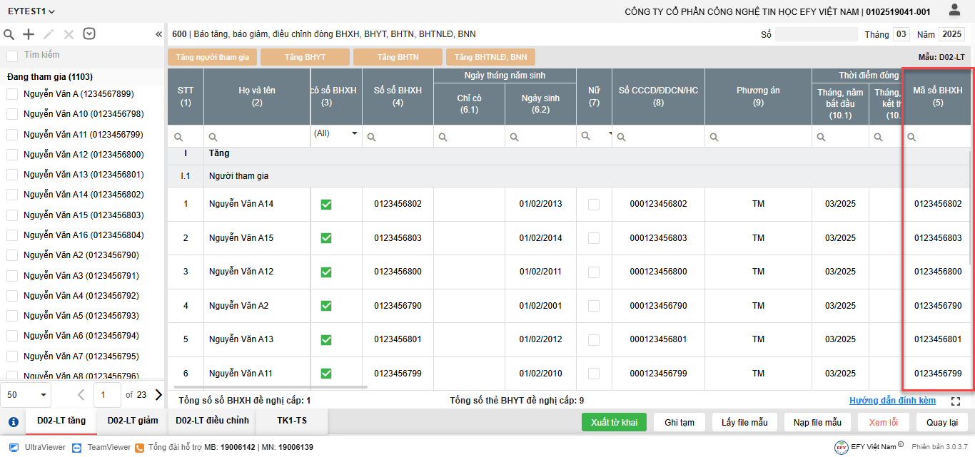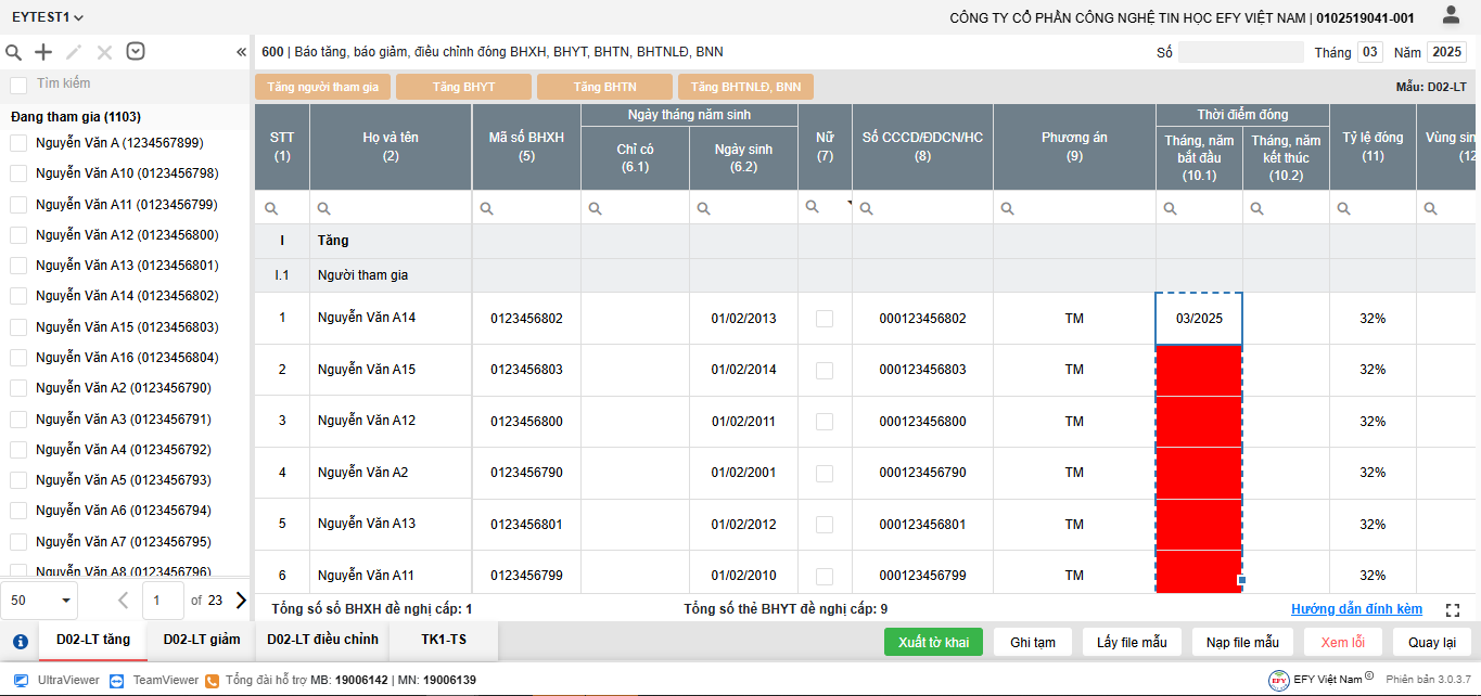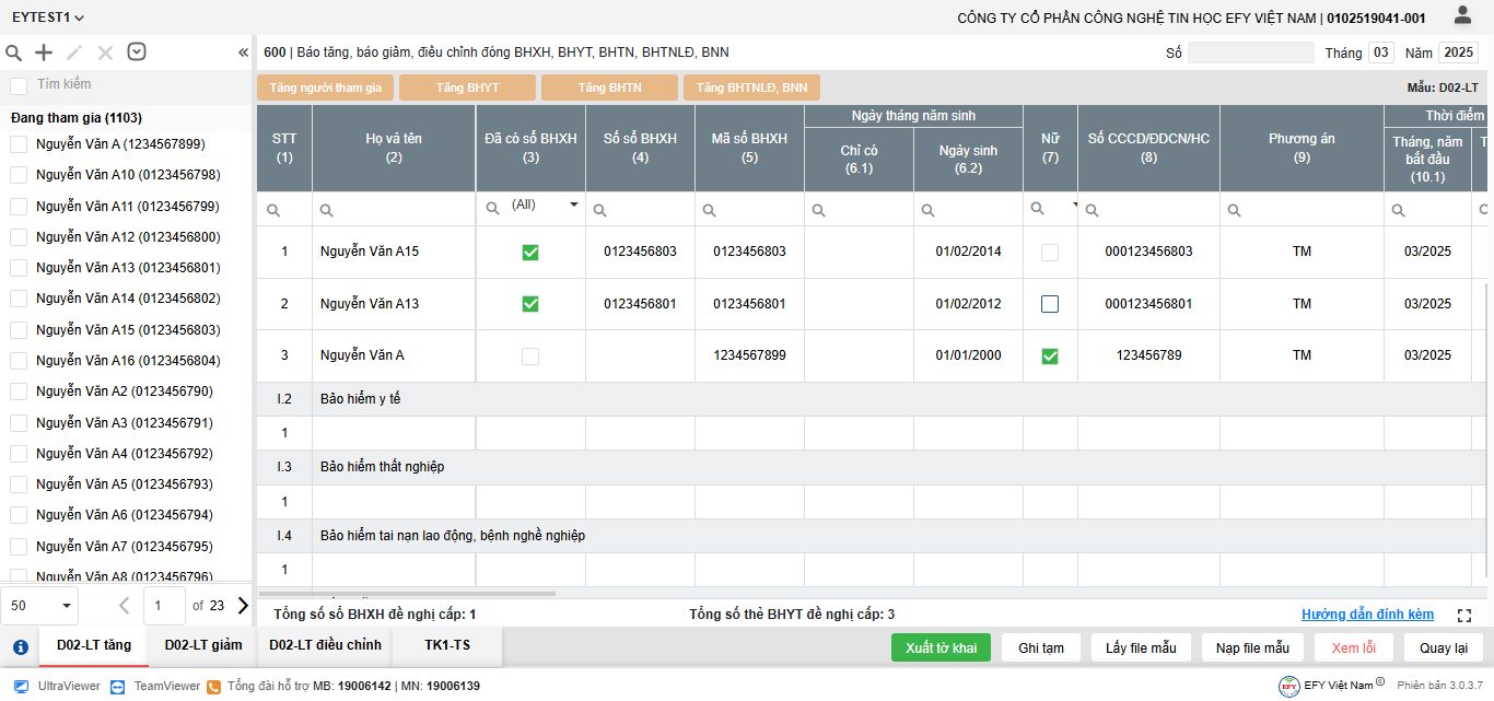 - Thêm dòng: thêm dòng mới để nhập thông tin người tham gia trên lưới kê khai