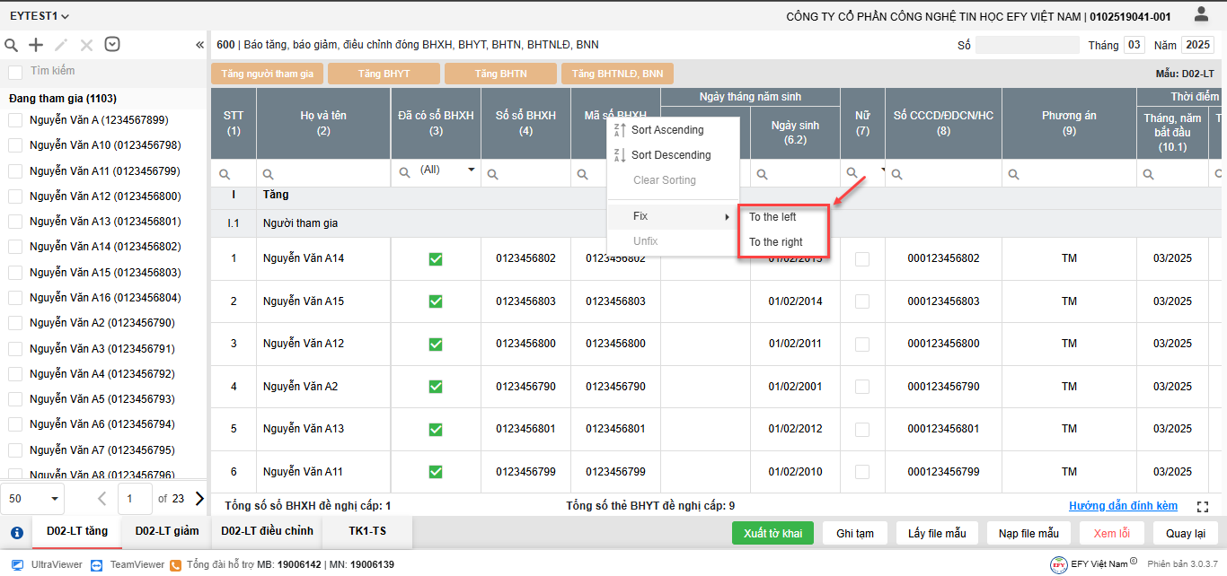 - Chọn cột cần cố định, nhấn chuột phải => tại mục Fix chọn vị trí cố định To the left (cố định bên trái), To the right (cố định bên phải)